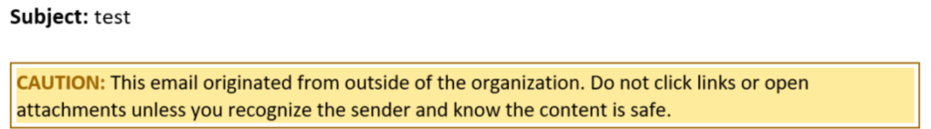 External Emails Tags: For whatever email delivery/handling technology your organization is using, such as Outlook, ProofPoint, or Gmail, there is an option to add a tag indicating an email is sent from a sender who is outside the organization. This is a simple warning message to let the user know and perhaps it will get them to pay extra caution to context and also urges them to verify where it came from and if it is expected. The following screenshot is an example of what this looks like: