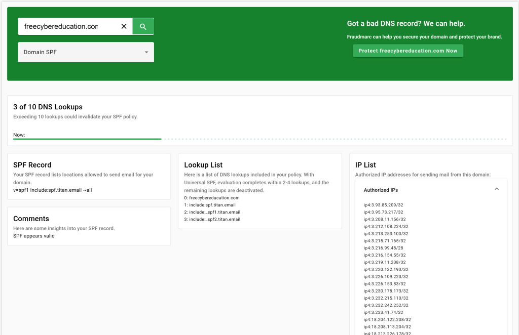 The format of SPF record can be something like shown in the example above or it can be specific IP addresses for servers such as the following: “v=spf1 include: [IP Address, Another IP Address]…” Using domain names instead of specific IPs indicates that you will authorize ALL IP addresses under the specified spf domain such can also be seen in the screenshot above if we pay attention to “IP List” section.