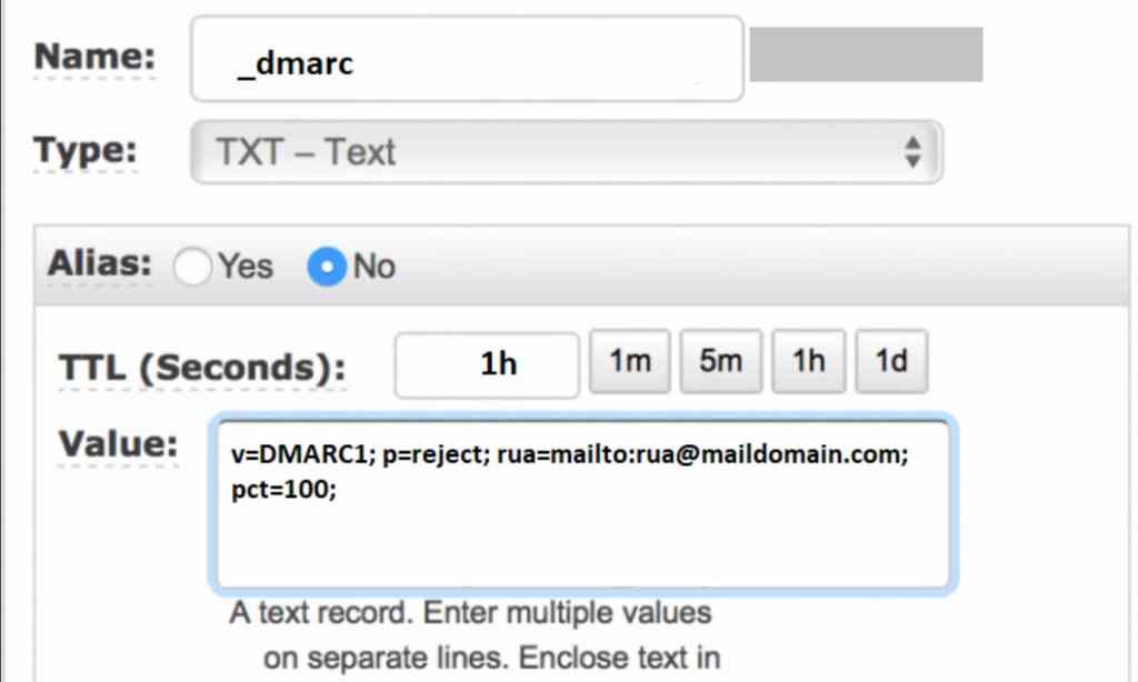 DMARC (Domain-based Message Authentication Reporting and Conformance) Record: In DMARC, you can specify what happens when both SPF and DKIM record results in “fail.” You have basic options such as none (take no action and continue to deliver), quarantine (deliver but quarantine), or reject (do not deliver, discard). In my opinion, best practice here is to set this to “reject.” You probably do not want to engage with a message that comes from an unverifiable source. Here is an example of what DMARC record looks like: